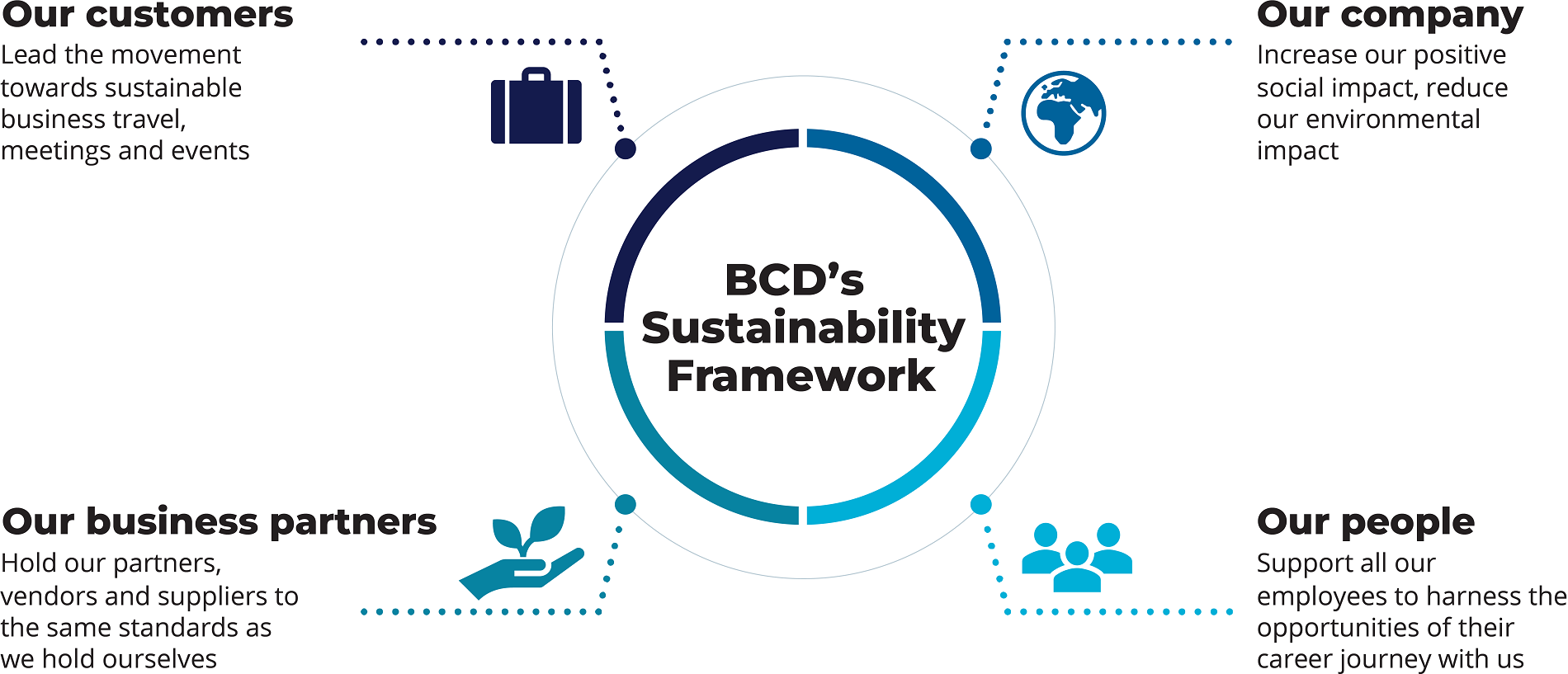 BCD Travel est depuis longtemps reconnue comme la TMC leader dans le domaine de la durabilité. Notre classement Platine EcoVadis, nos bureaux et systèmes certifiés ISO, ainsi que notre engagement de longue date envers le Pacte mondial des Nations Unies et les Objectifs de développement durable des Nations Unies nous distinguent. Il est maintenant temps de porter nos engagements et actions en matière de durabilité à un niveau supérieur. Nous devons utiliser la puissance de nos réseaux pour influencer un secteur des voyages d’affaires plus durable – un secteur qui crée une valeur significative pour les voyageurs, apporte des bénéfices tangibles aux personnes et aux lieux qui les accueillent, et minimise son impact sur l’environnement.